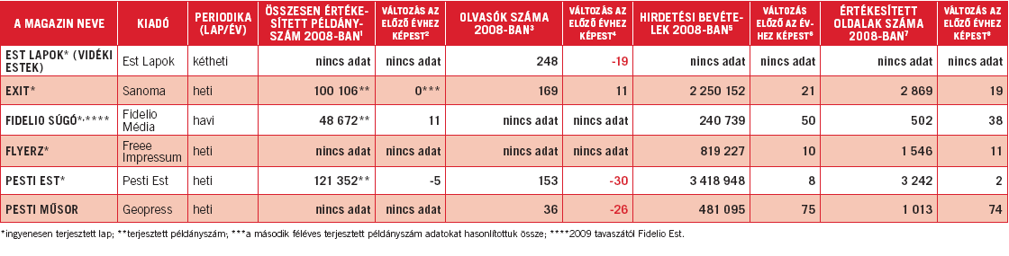 Idén eddig jelentős változások elsősorban az Est Media Groupnál (EMG) látszódnak: a második negyedévben megújulását tervező Pesti Est főszerkesztői székéből március elején távozott Darányi András, helyére a korábban az online megjelenésekért felelős Viszmeg Krisztina került. Az EMG-nek köszönhetően új piaci szereplőt is üdvözölhettünk, a brit Time Out programmagazin budapesti verziójával fizetős lapot dobtak piacra. Az angol nyelvű próbaszám már 2008 végén megjelent, az első igazi idén februárban jött ki, a magyar változat kiadása pedig 2009 második felében várható, bár a válság hatására ez az időpont nem kizárt, hogy tolódik majd. A lap mindenesetre a szintén fizetős Pesti Műsoron kívül az angol nyelvű Funzine-nak is konkurenciát jelenthet.