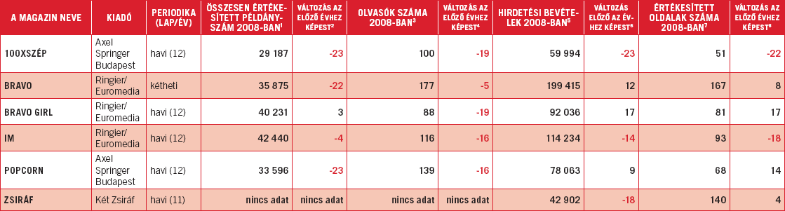 Alig észrevehetően volt kevesebb a gyermek-és ifjúsági lapok bevétele tavaly, de a Bravót leszámítva (ami öt százaléknyi olvasót veszített) minden nagy szereplő jelentős, 16-19 százalékos olvasottságcsökkenést könyvelhetett el. Hirdetési bevételek tekintetében vegyes a kép: a 100Xszép, a Zsiráf és az IM százalékban kifejezve kétszámjegyű csökkenését a Bravo, a Bravo Girl és a Popcorn növekedése ellensúlyozza. Egyébként az ifjúsági lapoknál is meglehetősen magas, 21 százalék a szerkesztőségi reklám és a rovatszponzoráció aránya.